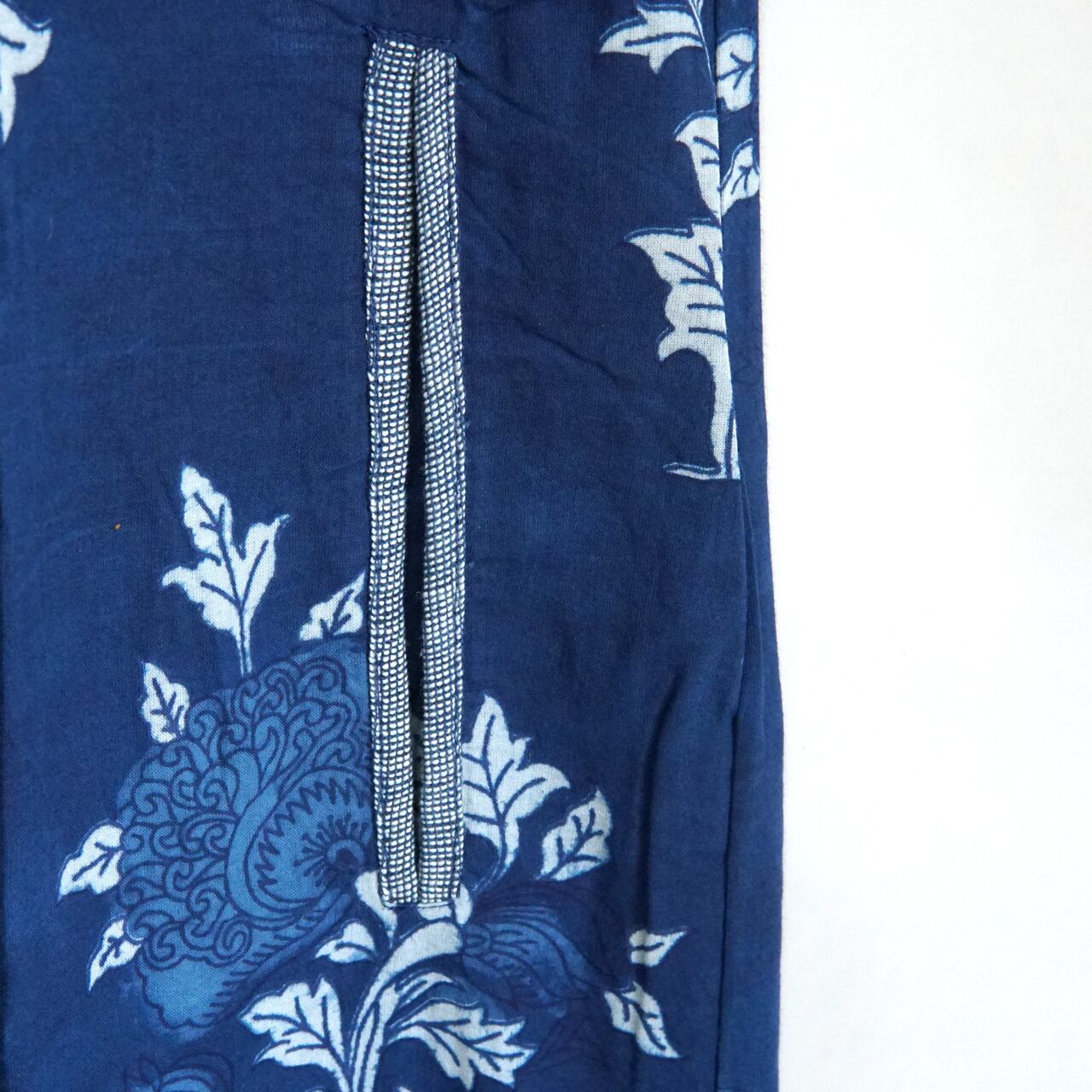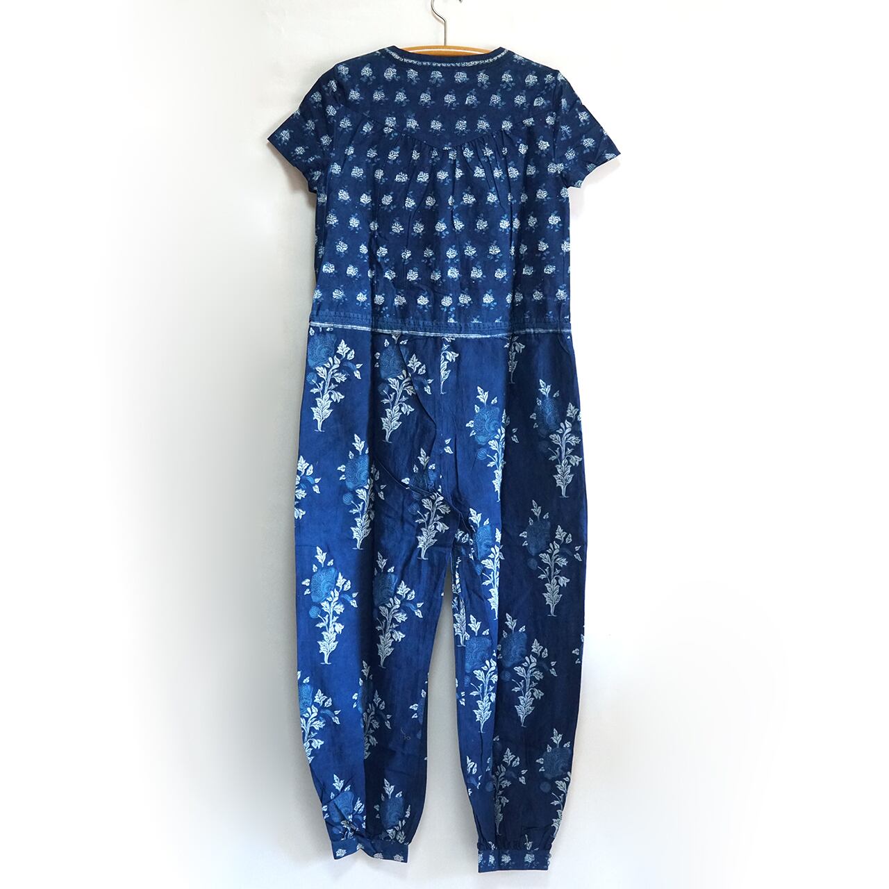 インディゴの豊かな深みと美しい柄が織り成す華やかなジャンプスーツ。